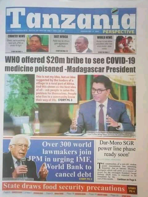 Today on Saturday 16th May, 2020 information reached the Media houses that despite WHO support for the COVID-19 drug from Madagascar, it also tried to bribe President of Madagascar Andry Rajoelina with $20 Million to poison the COVID-19 drug.This secret has been revealed by a local newspaper of Tanzania. Read the following information from the news paper.