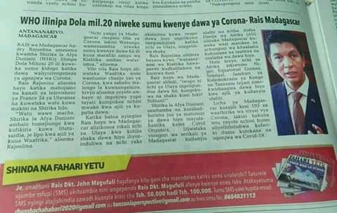 Today on Saturday 16th May, 2020 information reached the Media houses that despite WHO support for the COVID-19 drug from Madagascar, it also tried to bribe President of Madagascar Andry Rajoelina with $20 Million to poison the COVID-19 drug.This secret has been revealed by a local newspaper of Tanzania. Read the following information from the news paper.